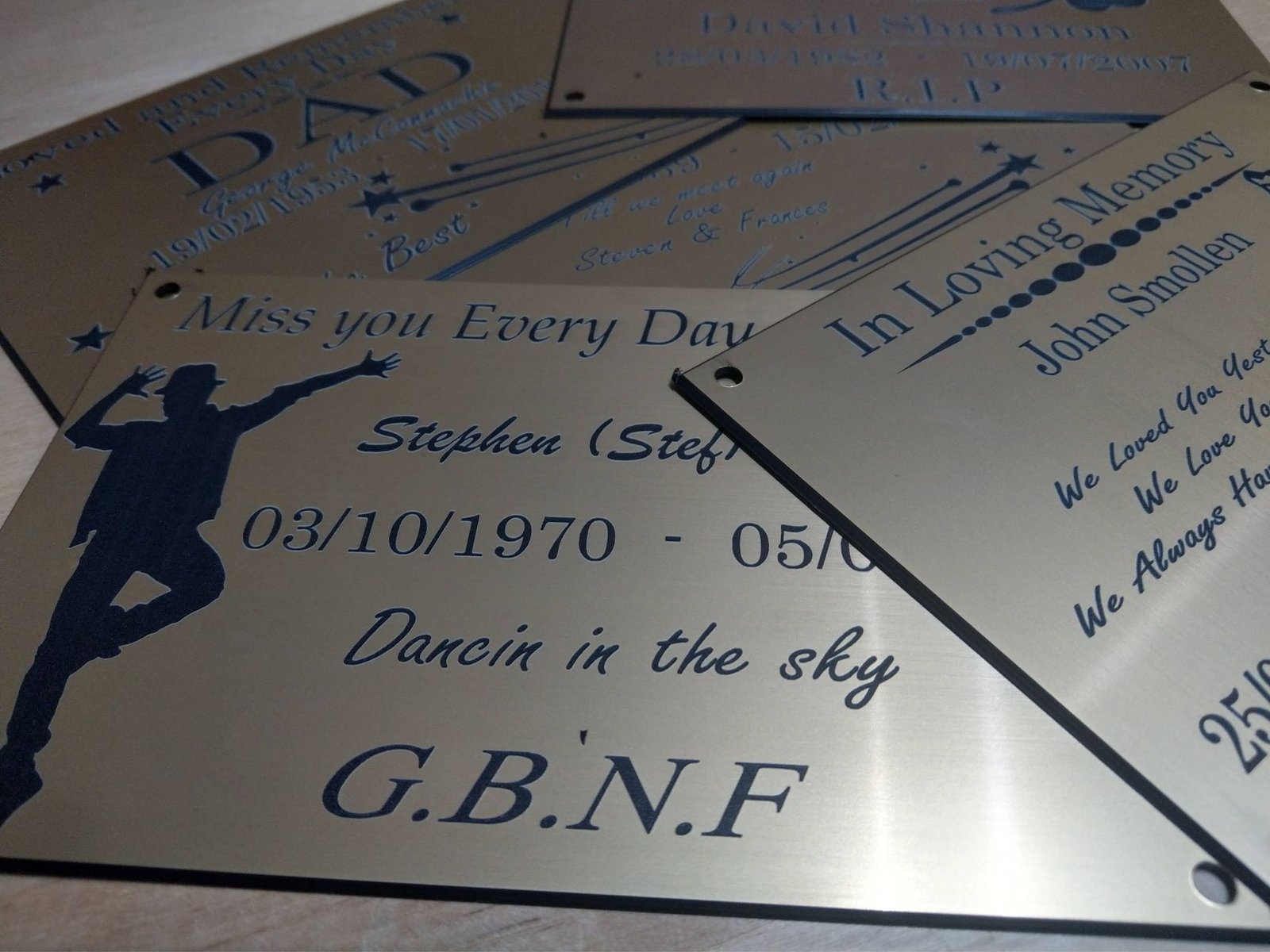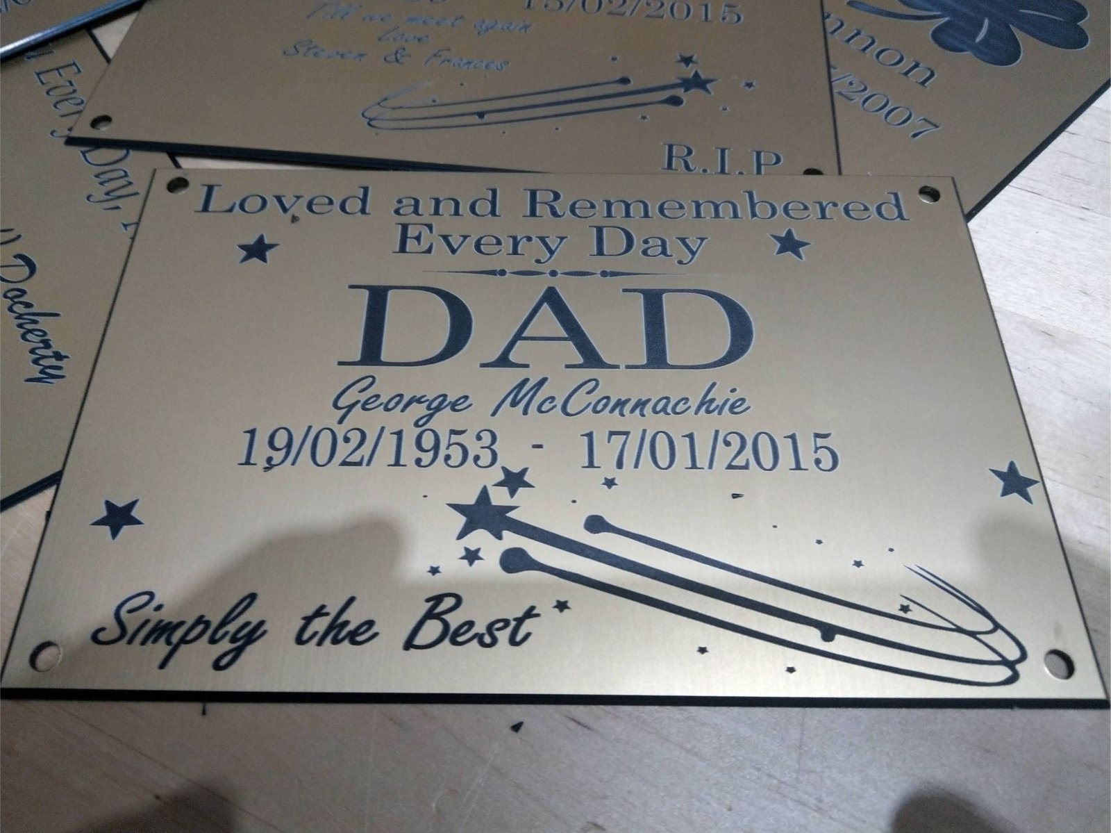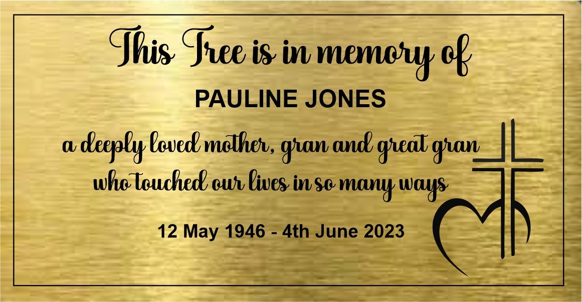 Laser engraved memorial plaque approx 200 x 100mm. Comes with beveled edge and 4 holes for screws. Brushed gold effect outdoor laminate engraved with your choice of wording, detail and clipart image.