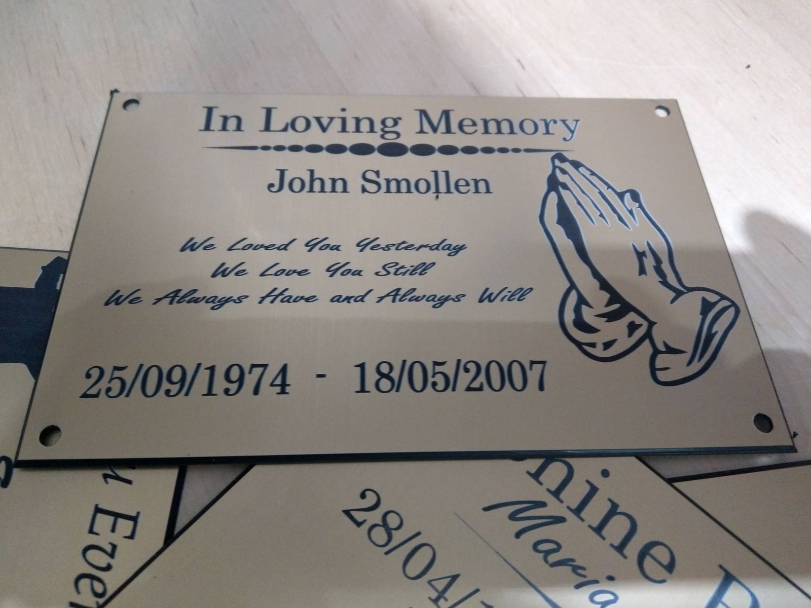 Laser engraved memorial plaque approx 200 x 100mm. Comes with beveled edge and 4 holes for screws.